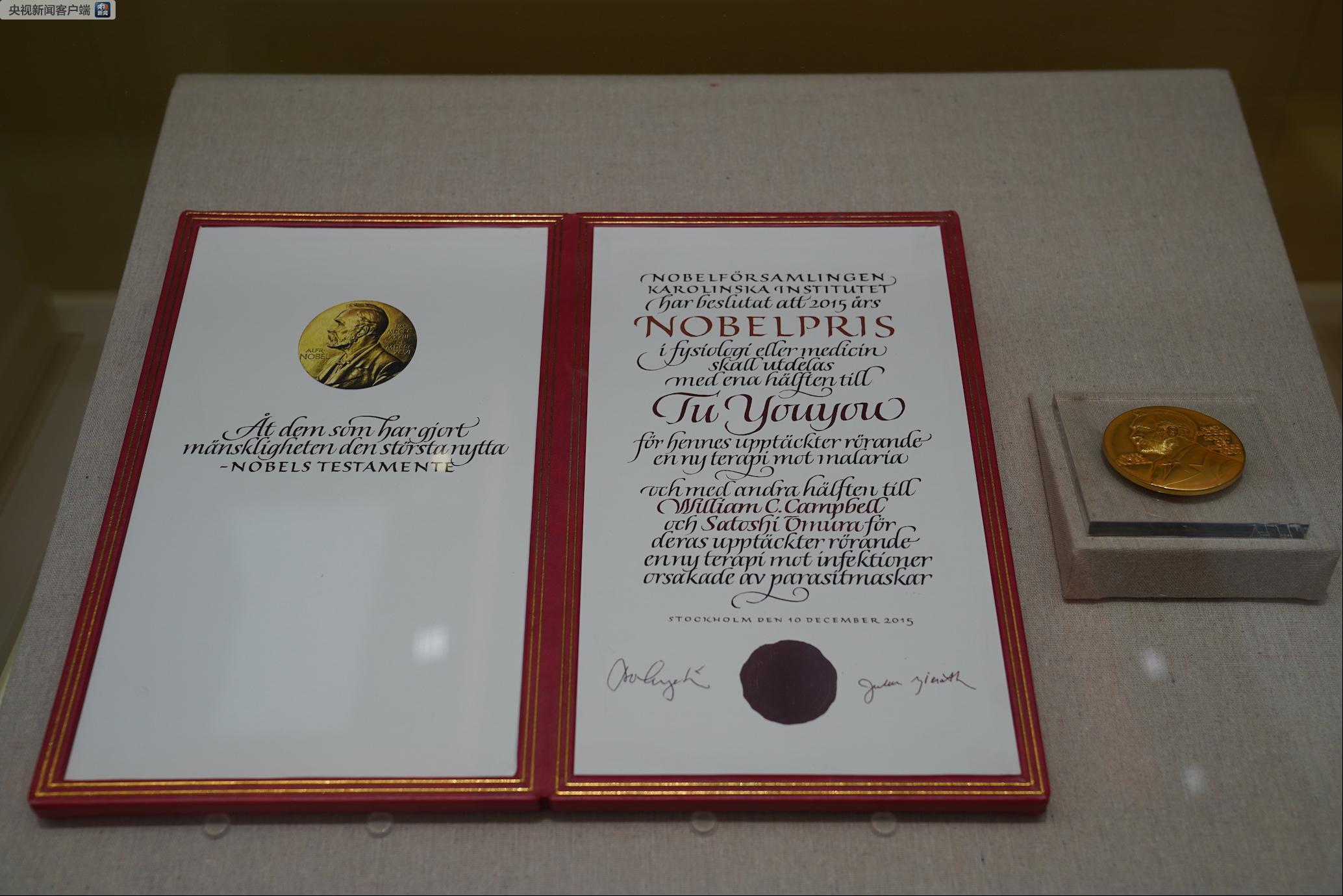 △2015年屠呦呦获得的诺贝尔生理学或医学奖奖章及证书。