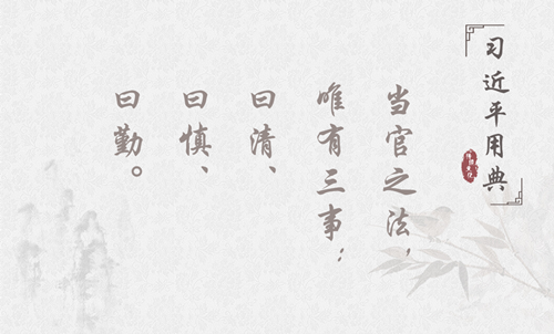 习近平总书记一直高度重视党员干部的官德修养。2004年任浙江省委书记时,他在《求是》发表《用权讲官德 交往有原则》一文,指出领导干部“既要依法用权,又要以德用权,归根到底用权要讲官德”。 他引用吕本中《官箴》中的这句话,并加以阐释:一要“清”,公正廉洁,两袖清风;二要“慎”,周密考虑,谨言慎行;三要“勤”,勤奋好学,刻苦上进。并提出好干部的五条标准:信念坚定、为民服务、勤政务实、敢于担当、清正廉洁,可以说是对“清、慎、勤”的现代解读。