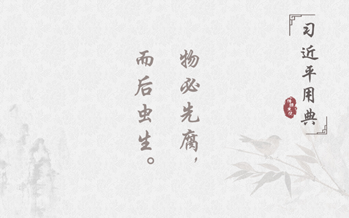“物必先腐,而后虫生”蕴含着深刻的哲理。这条古训是符合唯物辩证法原理的:在事物发展过程中,外因是变化的条件,内因是变化的根据,外因通过内因而起作用。内因是事物发展变化的第一位原因,腐败问题的关键在于腐败者自身道德素养不高,自控能力差,容易受到物质和金钱的诱惑。因此,我们要自重、自省、自警,抵得住诱惑,经得起考验。