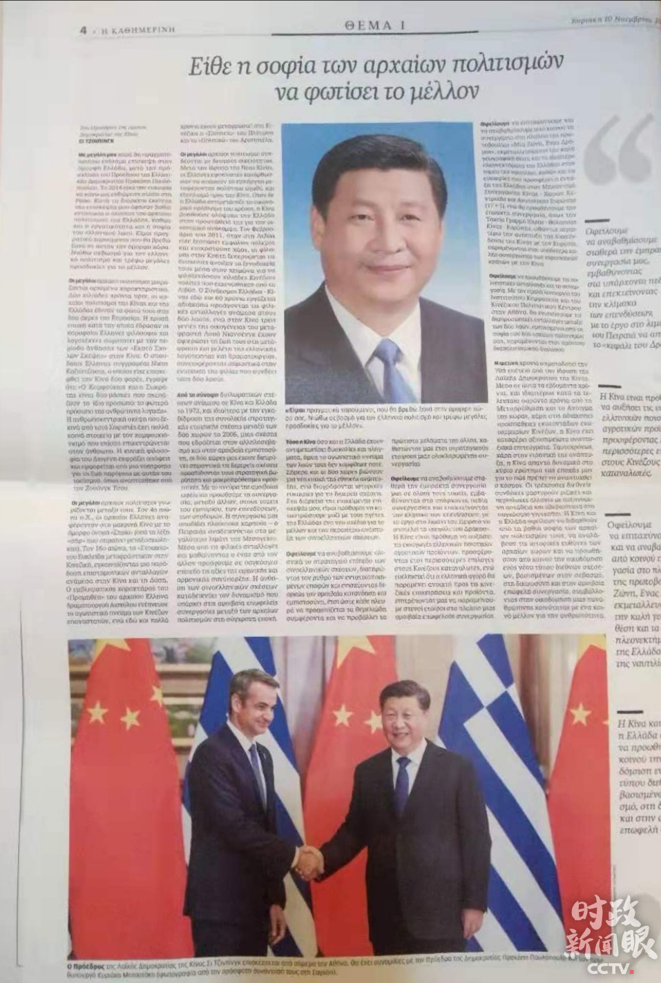 △发表在希腊《每日报》的署名文章。下方配图是11月4日会见希腊总理米佐塔基斯。(央视记者王玉国拍摄)