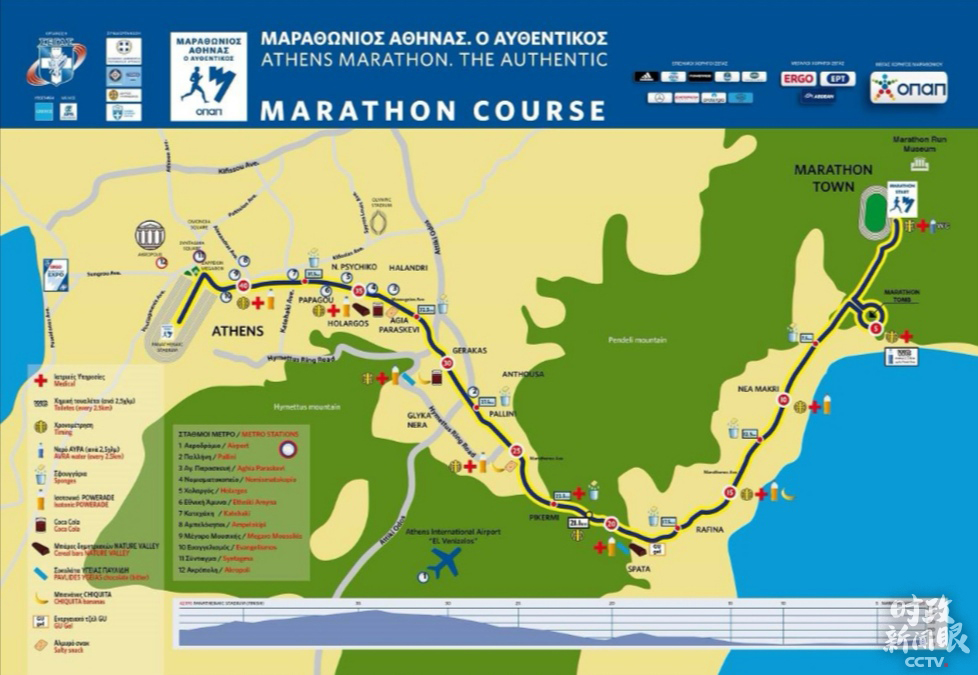 △雅典马拉松比赛线路图。东起马拉松镇,西至雅典古运动场遗址,全程42.195公里。(来源:2019雅典马拉松官网)