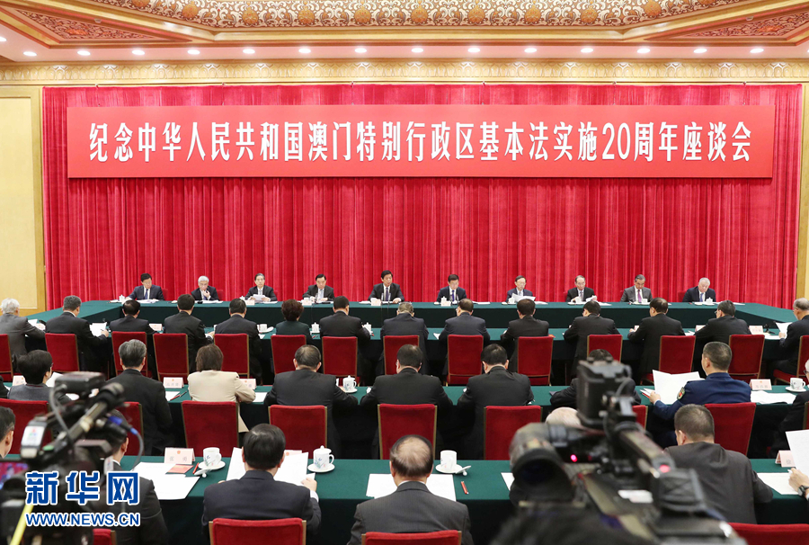 为了纪念澳门基本法实施20周年,今天,我们相聚在首都北京人民大会堂,隆重举行座谈会,缅怀邓小平同志等老一辈党和国家领导人开创的“一国两制”历史功绩,学习贯彻习近平总书记关于“一国两制”的重要论述,总结澳门基本法实施20年来的成功经验,坚定践行“一国两制”伟大事业的决心和信心,具有重要意义。