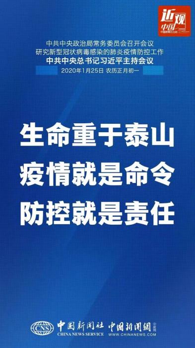 “生命重于泰山。疫情就是命令,防控就是责任。”1月25日,习近平在中央政治局常委会议上要求,“各级党政领导干部特别是主要领导干部要坚守岗位、靠前指挥,在防控疫情斗争中经受考验,深入防控疫情第一线,及时发声指导,及时掌握疫情,及时采取行动,做到守土有责、守土尽责。”