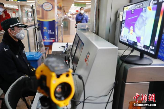 2月3日,工作人员在上海轨交1号线上海火车站站监控旅客测量体温情况。为做好上海市疫情防控工作,应对春运返程客流及复工上班客流,上海轨道交通自当日起,在9座车站的23个安检点启动乘客进站测温工作。中新社记者 殷立勤 摄