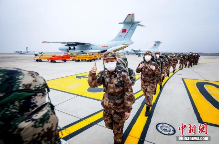 2月2日,中国空军8架大型运输机相继从沈阳、兰州、广州和南京飞抵武汉天河机场,向武汉紧急空运795名军队支援湖北医疗队队员和58吨物资。中新社发 陈晓东 摄