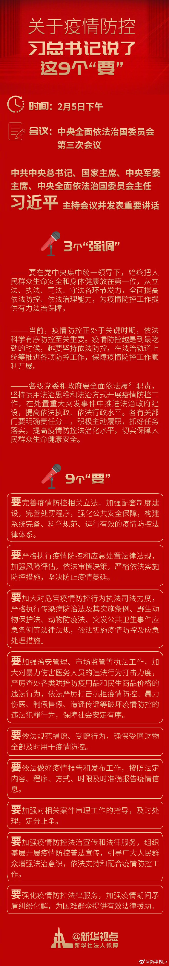 2月5日下午,中共中央总书记、国家主席、中央军委主席、中央全面依法治国委员会主任习近平主持召开中央全面依法治国委员会第三次会议强调,全面提高依法防控依法治理能力,为疫情防控提供有力法治保障。