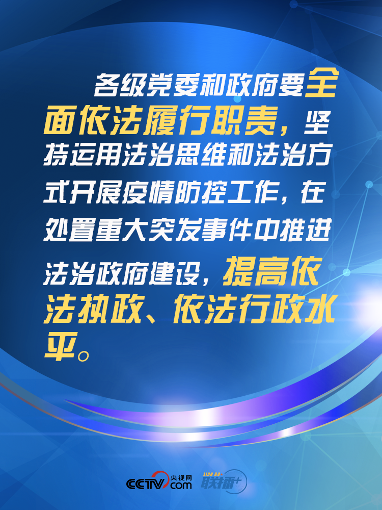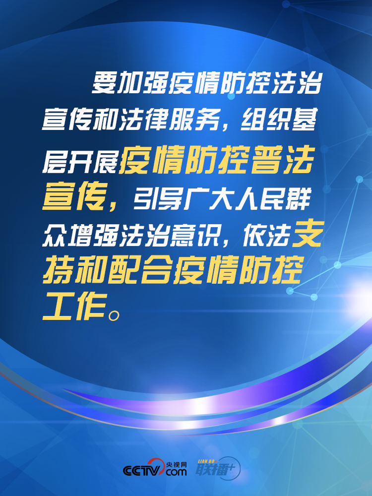 联播+2月5日下午,习近平主持召开中央全面依法治国委员会第三次会议强调,要在党中央集中统一领导下,始终把人民群众生命安全和身体健康放在第一位,从立法、执法、司法、守法各环节发力,全面提高依法防控、依法治理能力,为疫情防控工作提供有力法治保障。