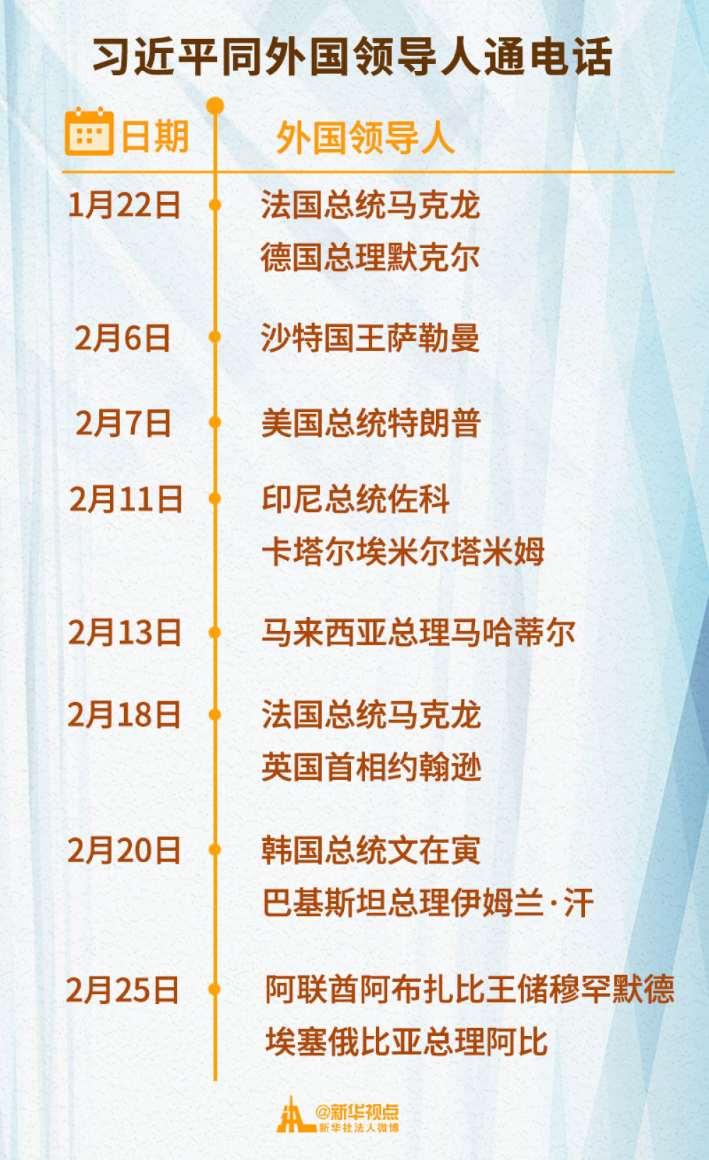 2月以来,习近平主席已先后同11位外国领导人通电话,涉及国家遍及亚洲、欧洲、非洲、美洲等地区。
