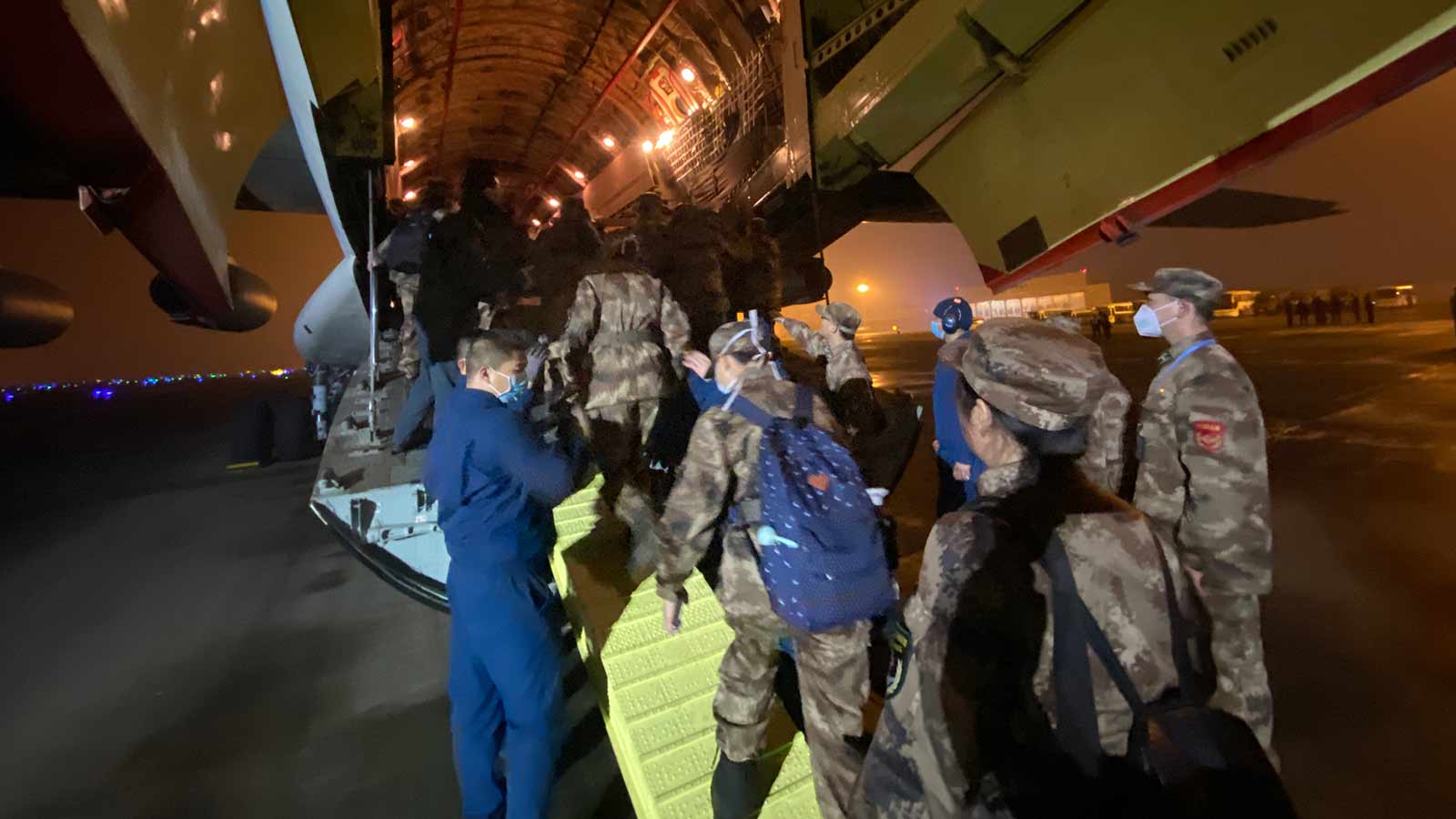 △1月24日,除夕夜,重庆江北国际机场,由陆军军医大学抽调精干医务人员组建的150人医疗队连夜出发,飞赴武汉支援抗击新冠肺炎疫情。