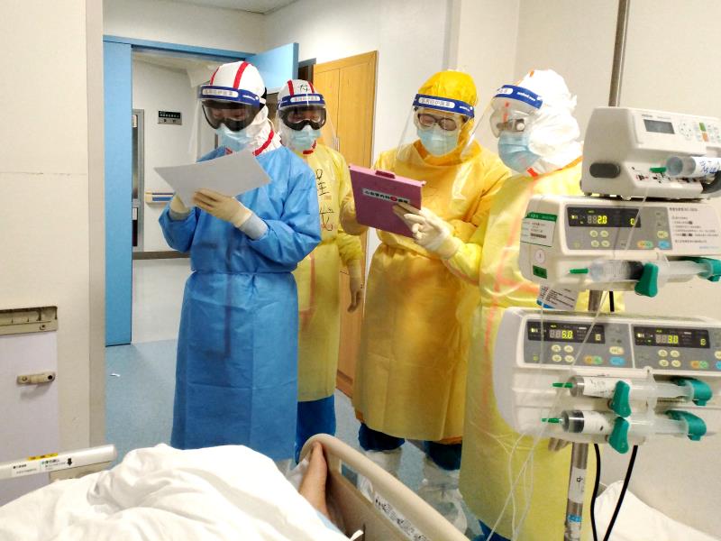 △2月11日,在武汉同济医院中法新城院区ICU病房内,来自北京协和医院的医护人员在病床旁查房交班。
