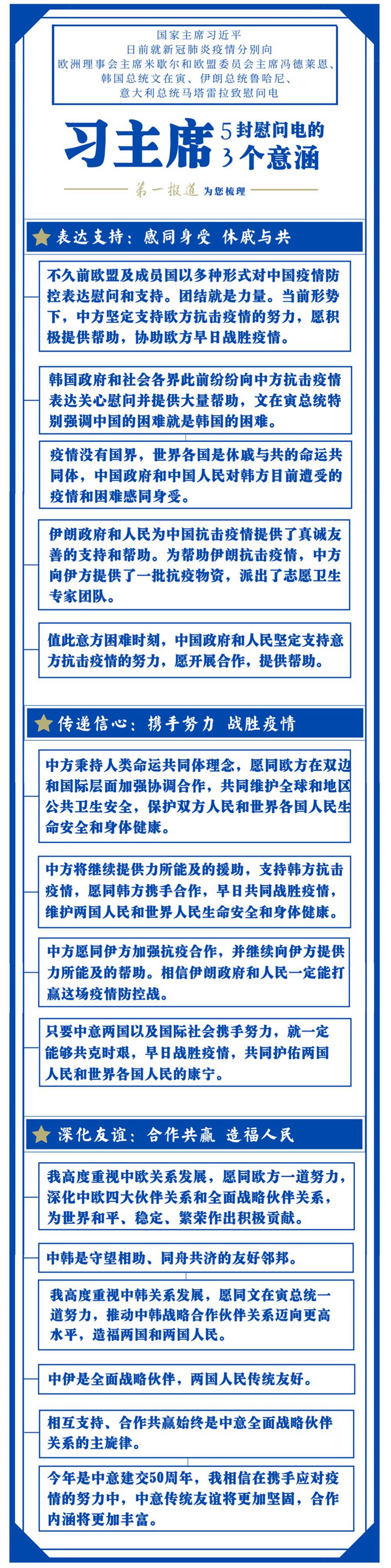 习近平在慰问电中强调,相互支持、合作共赢始终是中意全面战略伙伴关系的主旋律。值此意方困难时刻,中国政府和人民坚定支持意方抗击疫情的努力,愿开展合作,提供帮助。习近平指出,人类是一个命运共同体,唯有团结协作才能应对各种全球性风险挑战。只要中意两国以及国际社会携手努力,就一定能够共克时艰,早日战胜疫情,共同护佑两国人民和世界各国人民的康宁。今年是中意建交50周年,我相信在携手应对疫情的努力中,中意传统友谊将更加坚固,合作内涵将更加丰富。(记者:陈杉、郝薇薇;制图:陈杉;编辑:钱泳文、刘阳)