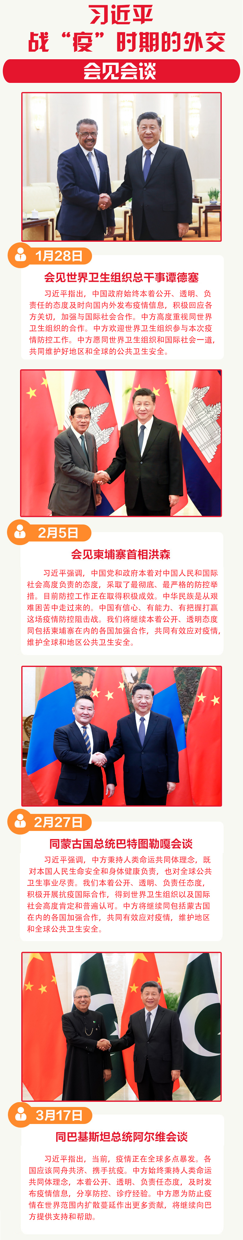 1月以来,习近平先后与世卫组织总干事谭德塞、柬埔寨首相洪森、蒙古国总统巴特图勒嘎、巴基斯坦总统阿尔维会见会谈。“患难见真情”,习近平对远道而来的朋友表示了感谢,并开诚布公地介绍了中国在疫情防控上的举措和进展。