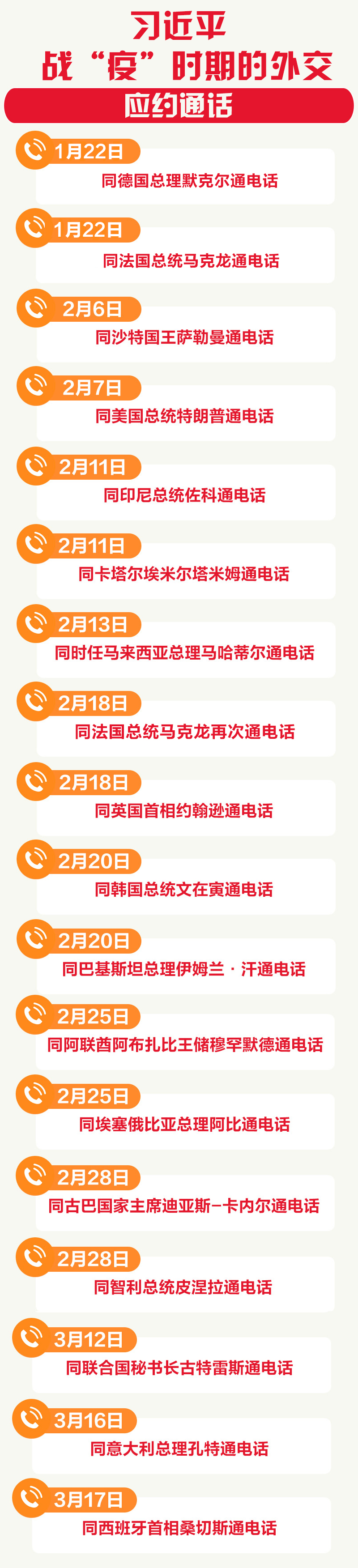 1月以来,习近平已18次同各国和国际组织领导人通电话。如此密集的“电话外交”,前所未有。在与各方的沟通交流中,习近平向国际社会传递了三点信息,一是表达感谢。疫情发生后,这些国家和国际组织给予中方宝贵的理解和支持,习近平向各方表示感谢。二是传递信心。一方面,习近平始终强调,疫情发生以来,中国采取了最严格的防控举措,打响了一场疫情防控的人民战争,中国有信心、有能力、有把握打赢这场疫情防控阻击战。另一方面,习近平表示,中国经济长期向好发展的趋势不会改变。三是展现担当。习近平在电话中强调,中国将继续本着人类命运共同体理念,同国际社会加强合作,共同战胜疫情。