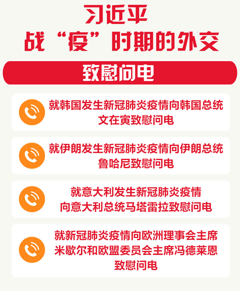 在韩国、伊朗、意大利、欧盟发生新冠肺炎疫情后,习近平分别向三国和欧盟领导人致慰问电。习近平在慰问电中强调,中方愿同各方携手合作,早日共同战胜疫情。