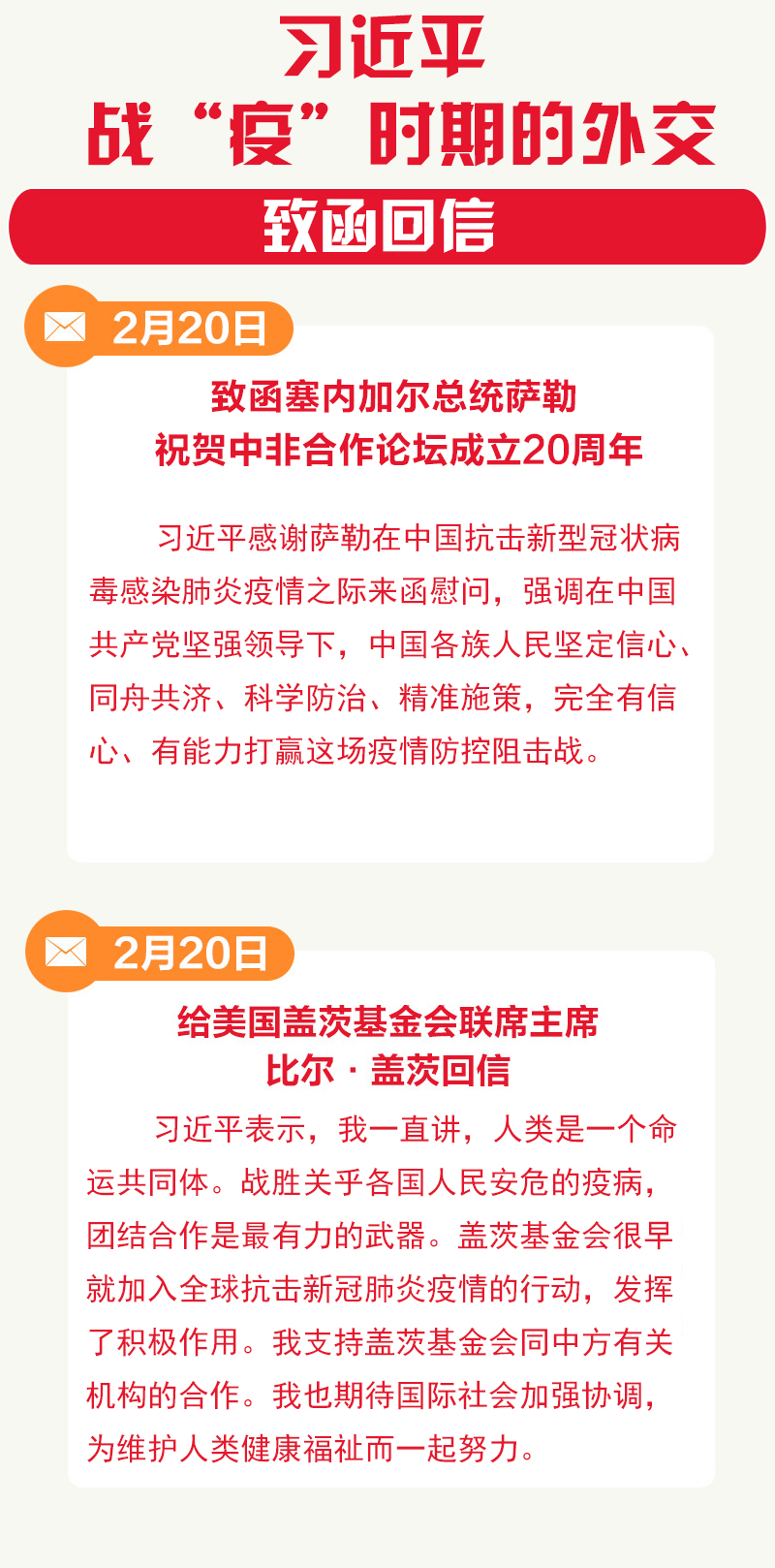 2月,习近平致函中非合作论坛非方共同主席国塞内加尔总统萨勒,祝贺中非合作论坛成立20周年,并感谢他在中国抗击新冠肺炎疫情之际来函慰问,强调在中国共产党坚强领导下,中国各族人民坚定信心、同舟共济、科学防治、精准施策,完全有信心、有能力打赢这场疫情防控阻击战。习近平给美国盖茨基金会联席主席比尔·盖茨回信,感谢他和盖茨基金会对中国防控新冠肺炎疫情工作的支持,呼吁国际社会加强协调、共同抗击疫情。
