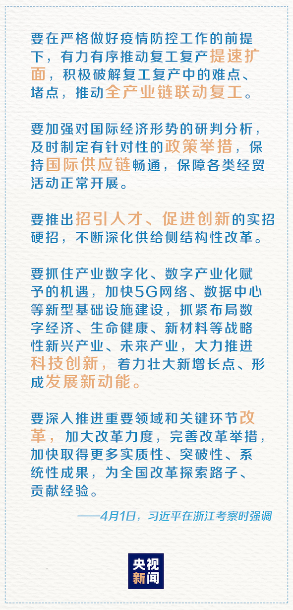 4月1日上午,正在浙江考察的习近平总书记对统筹推进疫情防控和经济社会发展工作作出了重要指示。如何克服疫情的影响恢复经济社会秩序,有力有序推动复工复产?习近平总书记的重要讲话为我们指明了清晰的方向。