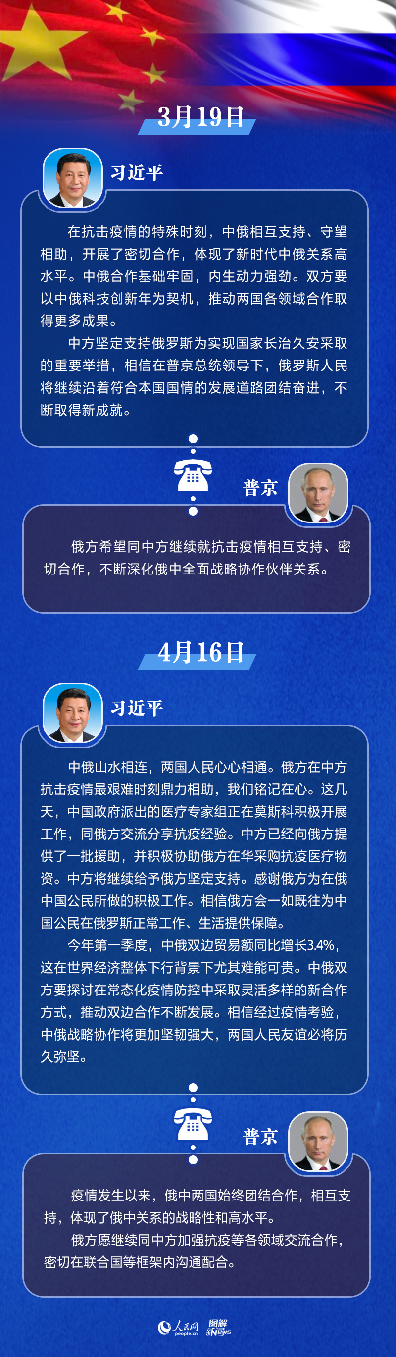 4月16日晚,国家主席习近平同俄罗斯总统普京通电话。这是一个月里,两国元首就更好开展疫情防控合作交流协调的第二次通话,体现了中俄关系的高水平,也向国际社会传递了中俄两国秉持人类命运共同体理念,愿同世界各国一道风雨同舟、携手抗疫的信心。