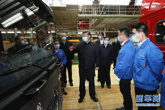 4月22日,习近平在陕西汽车控股集团有限公司总装车间察看生产线,了解产品研发、生产、销售和复工复产情况。 新华社记者 鞠鹏 摄