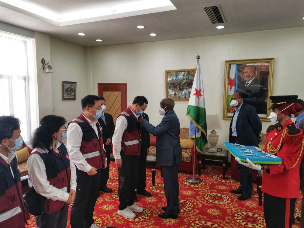 5月10日,吉布提总理卡米勒(中)在吉布提人民宫向中国政府抗疫医疗专家组成员颁授“6·27独立日”国家勋章。新华社发(中国驻吉布提大使馆供图)