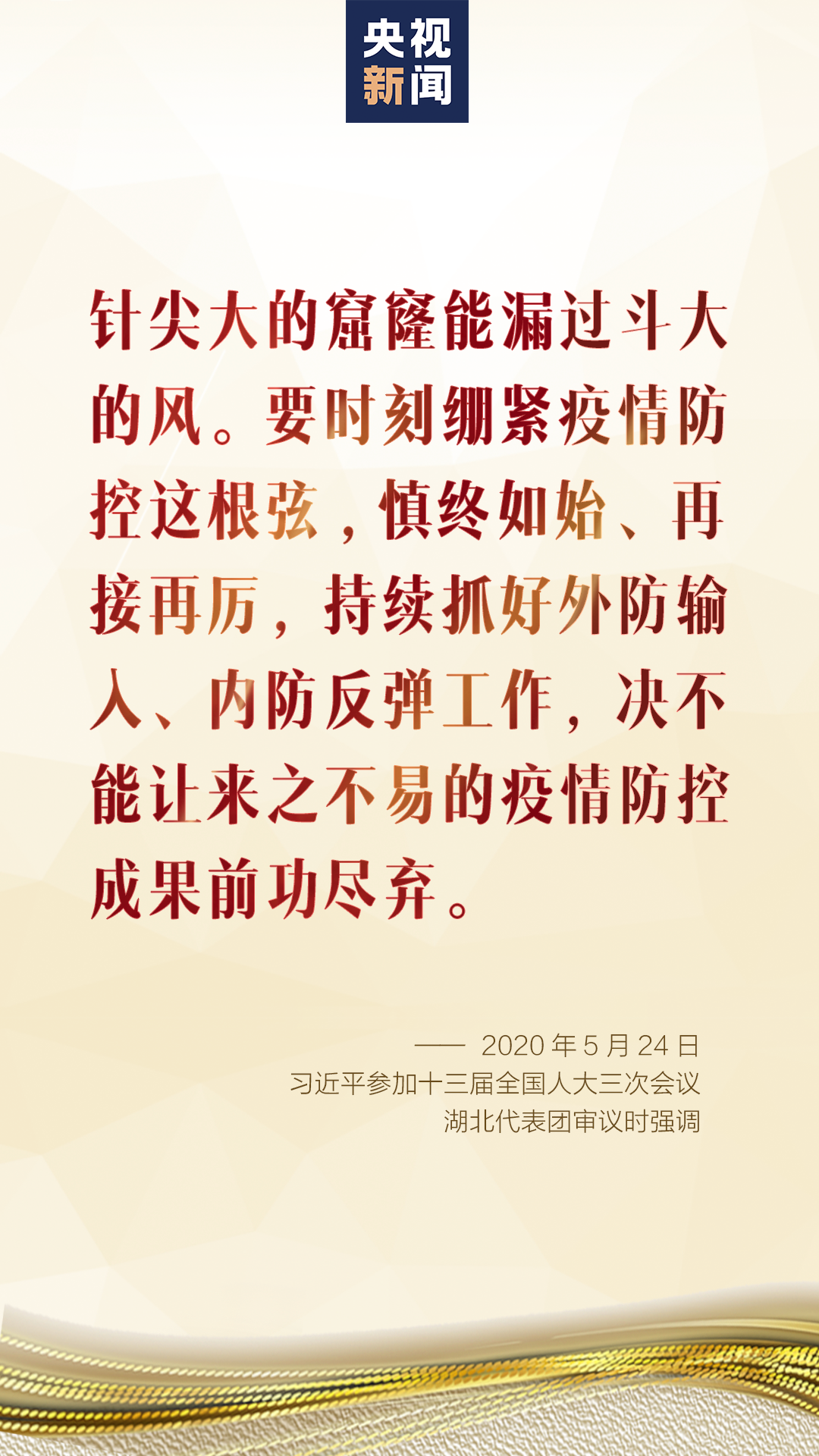 针尖大的窟窿能漏过斗大的风。要时刻绷紧疫情防控这根弦,慎终如始、再接再厉,持续抓好外防输入、内防反弹工作,决不能让来之不易的疫情防控成果前功尽弃。