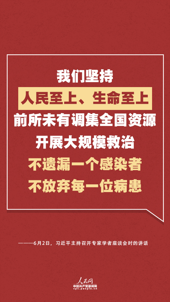 昨日的座谈会上,总书记再次提到“人民至上”。他强调,人民安全是国家安全的基石。他指出,这次新冠肺炎患者救治工作,我们坚持人民至上、生命至上,前所未有调集全国资源开展大规模救治,不遗漏一个感染者,不放弃每一位病患,从出生不久的婴儿到100多岁的老人都不放弃,确保患者不因费用问题影响就医。