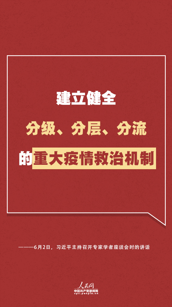 习近平指出,要统筹应急状态下医疗卫生机构动员响应、区域联动、人员调集,建立健全分级、分层、分流的重大疫情救治机制。他提出两大“能力”和一个“网络”等方面的要求: