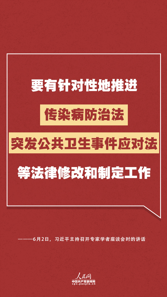 习近平强调,要有针对性地推进传染病防治法、突发公共卫生事件应对法等法律修改和制定工作,健全权责明确、程序规范、执行有力的疫情防控执法机制,进一步从法律上完善重大新发突发传染病防控措施,明确中央和地方、政府和部门、行政机关和专业机构的职责。