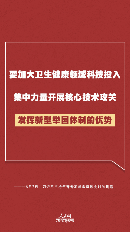 在座谈会上,习近平强调,科学技术是人类同疾病斗争的锐利武器,人类战胜大灾大疫离不开科学发展和技术创新。要加大卫生健康领域科技投入,集中力量开展核心技术攻关,发挥新型举国体制的优势。