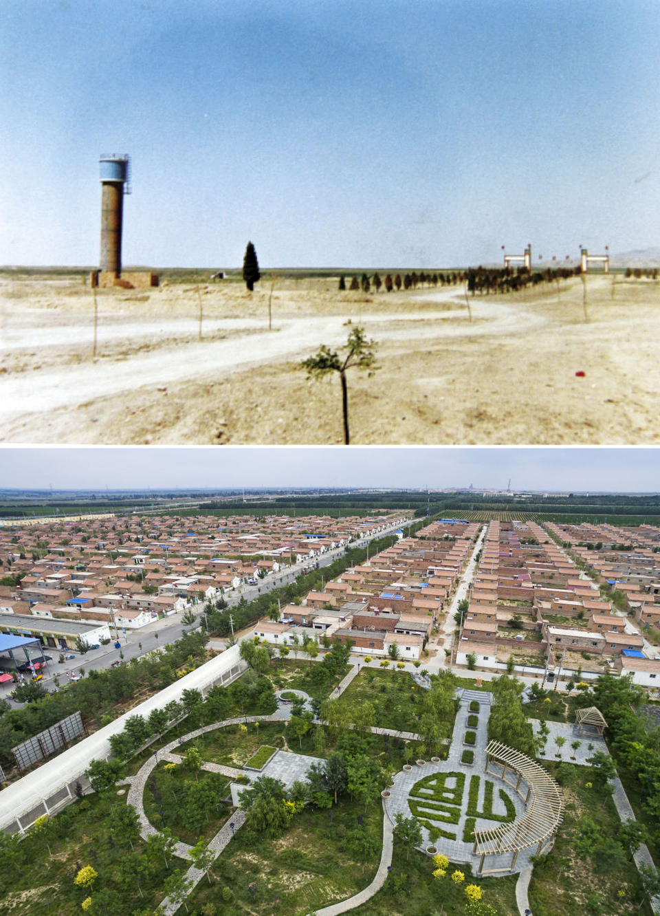 △上图为宁夏永宁县闽宁镇建设初期的乡镇雏形;下图为2016年7月22日拍摄的闽宁镇原隆移民村。