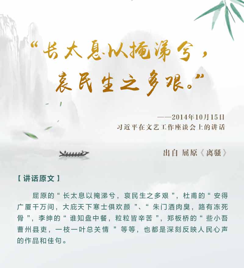 “长太息以掩涕兮,哀民生之多艰。”2014年10月15日,在文艺工作座谈会上,习近平吟诵出屈原悲叹民生不兴的诗句。屈原一心为民、体恤苍生,他所作诗作中散发出的爱民、忧民气息,时隔千年,依然能够引起今人的共鸣。