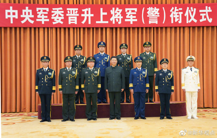 晋衔仪式在嘹亮的军歌声中结束。随后,习近平等领导同志同晋升上将军衔警衔的军官警官合影。