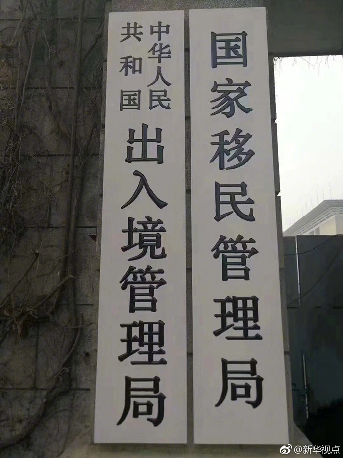 4月2日,新组建的国家移民管理局正式挂牌。国家移民管理局将公安部的出入境管理、边防检查职责整合,建立健全签证管理协调机制,加挂中华人民共和国出入境管理局牌子,由公安部管理。(新华社“新华视点”微博 记者 刘奕湛)