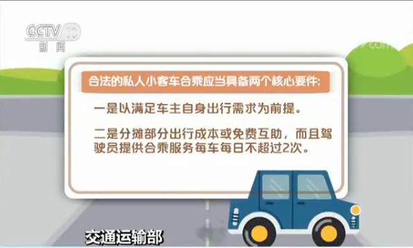 交通运输部表示,合法的私人小客车合乘应当具备两个核心要件:一是以满足车主自身出行需求为前提,二是分摊部分出行成本或免费互助,而且驾驶员提供合乘服务每车每日不超过2次。