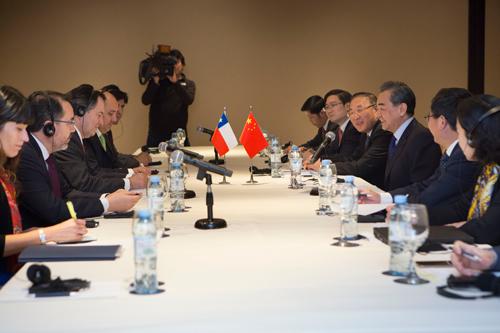 王毅表示,智利是中国在拉美的友好国家,两国虽然相距遥远,但开放的理念和自由贸易协定把我们紧密联系在一起,近年来双方经贸合作快速增长,给两国人民带来实实在在的利益。中方赞赏智利政府坚定致力于发展对华关系,愿将“一带一路”倡议同智利“2025投资计划”相互对接,推进基础设施、互联互通等各领域互利合作,加强人文交流,实现共同发展繁荣。希望智利在中拉共建“一带一路”过程中继续发挥积极示范作用。我们对中智全面战略伙伴关系的前景充满信心和期待。