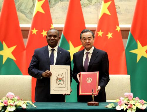中新网5月26日电 据外交部网站消息,5月26日下午,国务委员兼外交部长王毅在北京同布基纳法索外长巴里举行会谈并签署《中华人民共和国与布基纳法索关于恢复外交关系的联合公报》。王毅表示,事实证明,坚持一个中国原则是人心所向、大势所趋。任何企图分裂中国的行径、任何阻挡历史前进的逆流,都不过是螳臂当车,注定遭到失败。