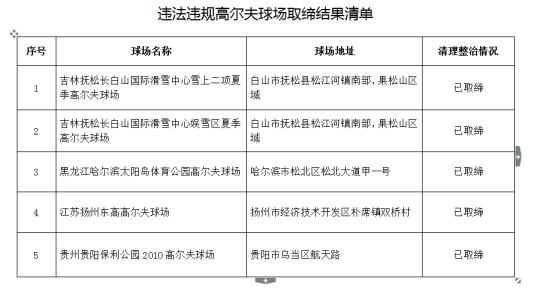 人民网北京7月11日电 (邢郑) 据国家市场监管总局网站显示,2017年,国家发展改革委、原国土资源部、原环境保护部、住房城乡建设部、水利部、原农业部、原工商总局、体育总局、原国家林业局、原国家旅游局、原银监会等11部门继续开展高尔夫球场清理整治工作,共发现吉林抚松长白山国际滑雪中心雪上二项夏季高尔夫球场和娱雪区夏季高尔夫球场、黑龙江哈尔滨太阳岛体育公园高尔夫球场、江苏扬州东高高尔夫球场、贵州贵阳保利公园2010高尔夫球场等5个高尔夫球场存在弄虚作假、死灰复燃、恢复建设、隐瞒不报等严重问题,上述高尔夫球场均已被地方政府取缔,并严肃追究了相关单位和人员的责任。