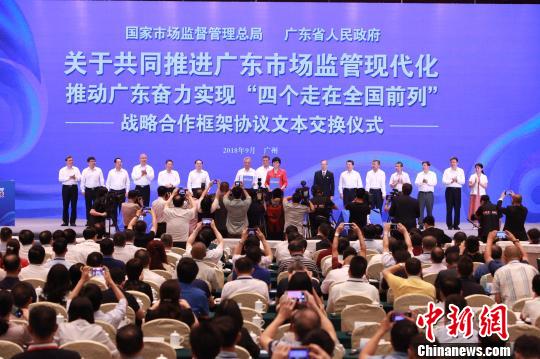 中新网广州9月6日电 (记者 许青青)由国家市场监督管理总局和广东省人民政府联合主办的2018市场监督管理论坛6日在广州举行,论坛上,国家市场监督管理总局和广东省人民政府就共同推进广东市场监管现代化达成战略合作。