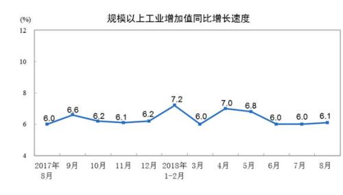 中新网9月14日电 据国家统计局网站消息,2018年8月份,规模以上工业增加值同比实际增长6.1%(以下增加值增速均为扣除价格因素的实际增长率),比7月份加快0.1个百分点。从环比看,8月份,规模以上工业增加值比上月增长0.52%。1-8月份,规模以上工业增加值同比增长6.5%,增速较1-7月份回落0.1个百分点。