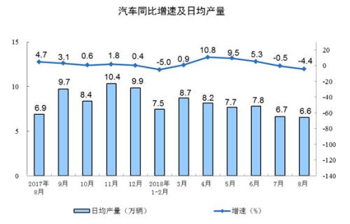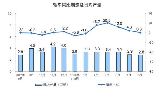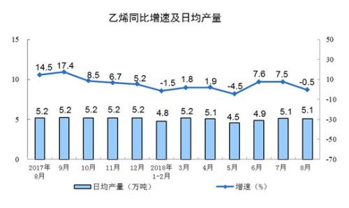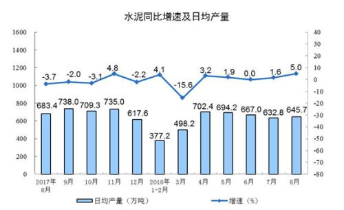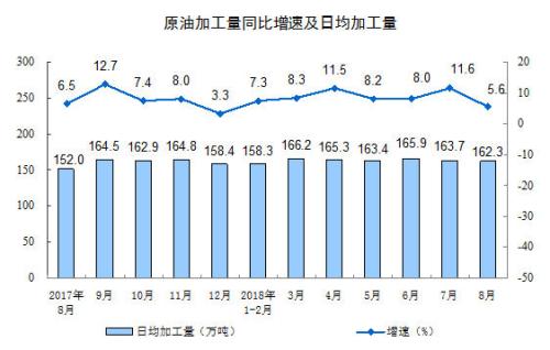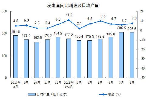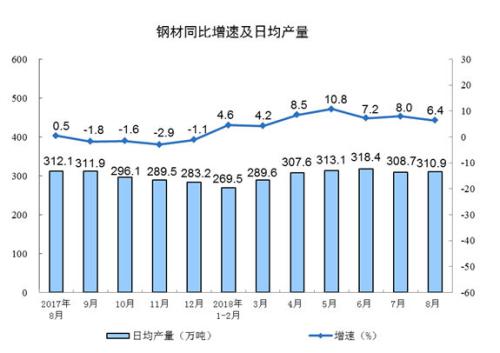 分产品看,8月份,596种产品中有336种产品同比增长。其中,钢材9638万吨,同比增长6.4%;水泥20018万吨,增长5.0%;十种有色金属454万吨,增长5.7%;乙烯158万吨,下降0.5%;汽车203.2万辆,下降4.4%;轿车88.3万辆,增长0.3%;发电量6405亿千瓦时,增长7.3%;原油加工量5031万吨,增长5.6%。
