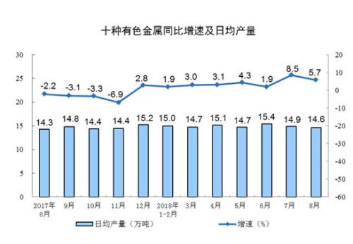 分行业看,8月份,41个大类行业中有36个行业增加值保持同比增长。其中,农副食品加工业增长6.0%,纺织业同比持平,化学原料和化学制品制造业增长4.8%,非金属矿物制品业增长5.2%,黑色金属冶炼和压延加工业增长5.9%,有色金属冶炼和压延加工业增长9.5%,通用设备制造业增长5.9%,专用设备制造业增长9.8%,汽车制造业增长1.9%,铁路、船舶、航空航天和其他运输设备制造业下降0.5%,电气机械和器材制造业增长3.3%,计算机、通信和其他电子设备制造业增长17.1%,电力、热力生产和供应业增长10.0%。