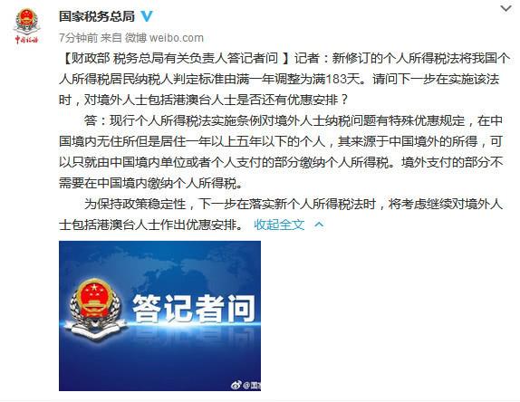 记者:新修订的个人所得税法将我国个人所得税居民纳税人判定标准由满一年调整为满183天。请问下一步在实施该法时,对境外人士包括港澳台人士是否还有优惠安排?