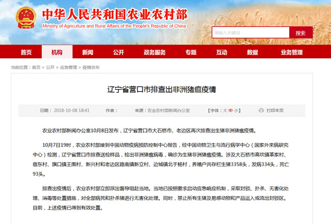 10月7日19时,农业农村部接到中国动物疫病预防控制中心报告,经中国动物卫生与流行病学中心(国家外来病研究中心)检测,辽宁省营口市排查送检样品,检出非洲猪瘟病毒,确诊为生猪非洲猪瘟疫情。涉及大石桥市高坎镇革家村、宿东村、旗口镇王围村、新兴村和老边区路南镇新立村、边城镇北于杨村,养殖户共存栏生猪3358头,发病334头,死亡93头。