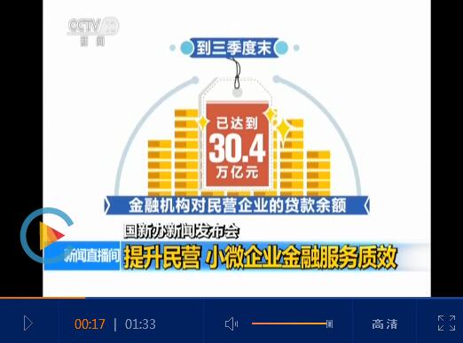 央视网消息:国新办昨天(30日)举行新闻发布会,介绍近期银行业和保险业服务民营企业、小微企业的有关情况。