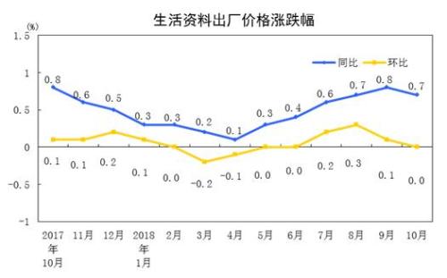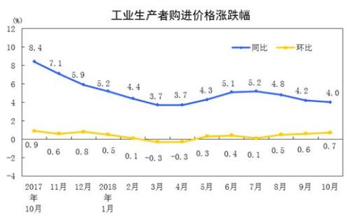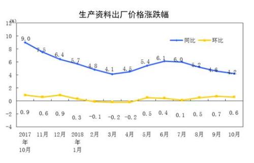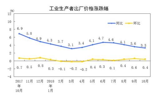 中新网11月9日电 据国家统计局网站消息,2018年10月份,全国工业生产者出厂价格同比上涨3.3%,环比上涨0.4%。工业生产者购进价格同比上涨4.0%,环比上涨0.7%。1-10月平均,工业生产者出厂价格比去年同期上涨3.9%,工业生产者购进价格上涨4.5%。