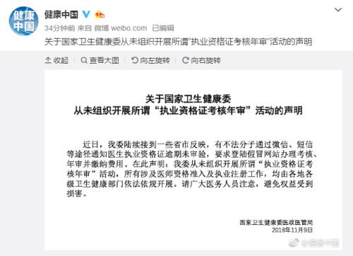 中新网客户端11月9日电(记者 张尼)国家卫健委日前发布消息称,近日,陆续接到一些省市反映,有不法分子通过微信、短信等途径通知医生执业资格证逾期未审验,要求登陆假冒网站办理考核、年审并缴纳费用。国家卫健委发布声明,从未组织开展所谓“执业资格证考核年审”活动,所有涉及医师资格准入及执业注册工作,均由各地各级卫生健康部门依法依规开展。请广大医务人员注意,避免权益受到损害。