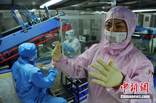 图为技术工人正在车间检查刚生产出来的触摸屏产品。(资料图片)中新社记者 张斌 摄
