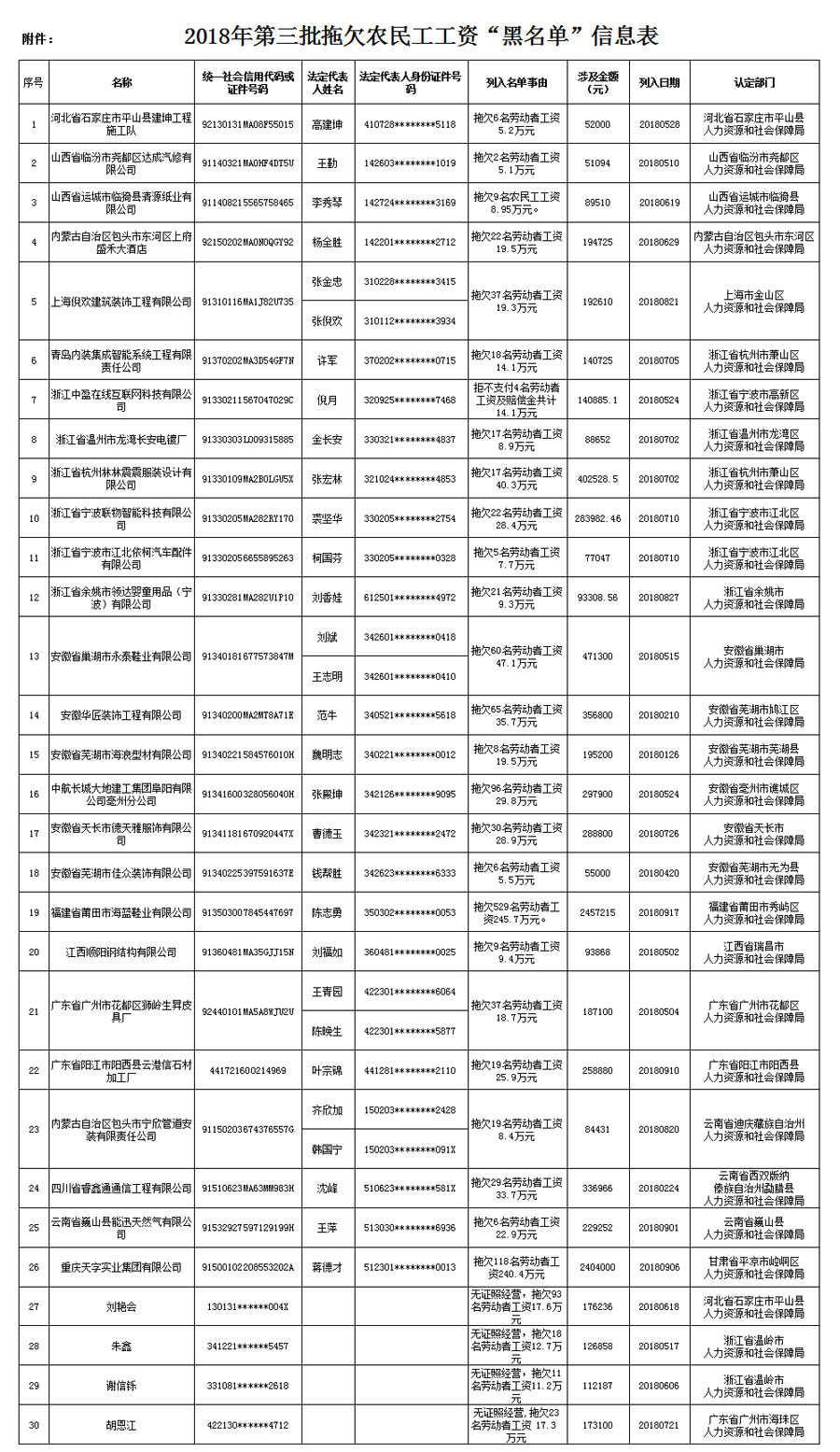 中新网12月28日电 据人社部网站消息,为加大对拖欠农民工工资违法行为惩戒力度,督促企业依法支付劳动者工资,人社部发布并向发改委推送第三批共30条拖欠农民工工资“黑名单”信息。该批名单包括26家用人单位和4个自然人。这些违法失信主体在用工过程中都存在拖欠农民工工资、严重侵害农民工合法权益的行为。