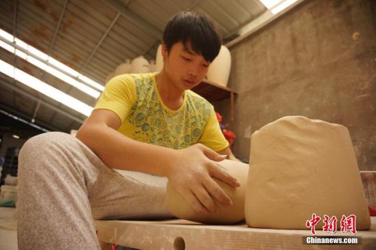 资料图:一位稚气未脱的小学徒在反复揉捏、摔打一块瓷泥,以求制作出来的瓷胎坚实。 王昊阳 摄