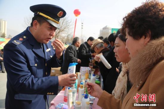 图为工作人员向消费者介绍辨别假冒伪劣洗漱用品的知识。中新社发 张添福 摄