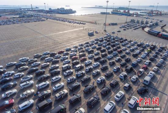 资料图:航拍在海口新海港码头排队等待上船的车辆。 骆云飞摄